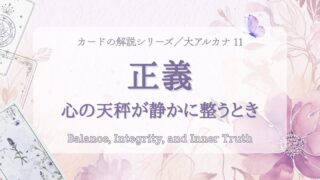 【カード解説】大アルカナ11番「正義」。象徴・心理の側面・正位置/逆位置の意味を丁寧に紐解く。感情に流されず、事実を見つめ直し、責任ある判断と内なる均衡を見つめたい方へ。